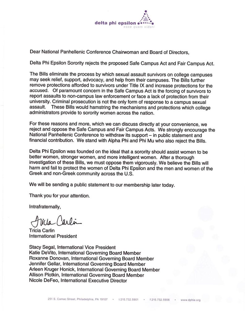 https://pbs.twimg.com/media/CTt8h7iWwAAoxXa.jpg:large Sigma Delta Tau has said that they opposed supporting the bills at the annual NPC meeting last month, Delta Gamma HQ says they do not sponsor any current legislation regarding sexual assault on college campuses and Alpha Gamma Delta has also voiced their disapproval of both bills. |