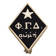 A gold diamond with black enamel with the greek letters: Phi Gamma Delta; below it the greek letters: alpha, omega, mu, eta; and the white star at the top.