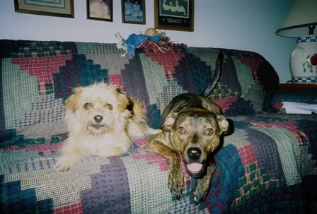 A Border Terrier (possibly purebred) but she was rescued too and a Pit Bull mix who is my heart and soul. Here they are on the couch: