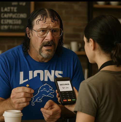 So, it actually was in this order. He goes from really mad about his card declining, provided to him by the Detroit Lions to calm after they gave him the coffee and bagel for free.